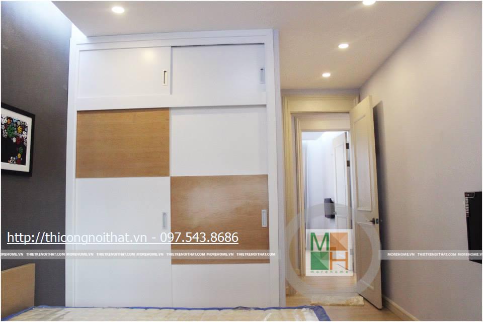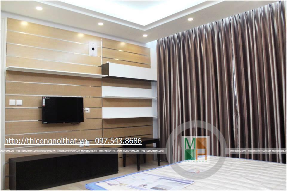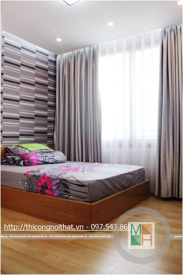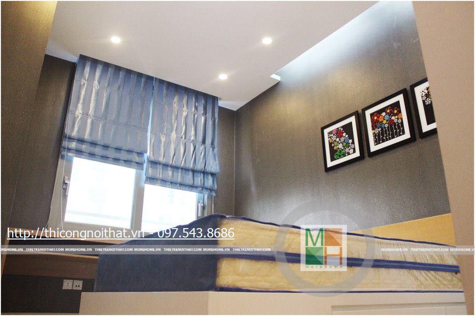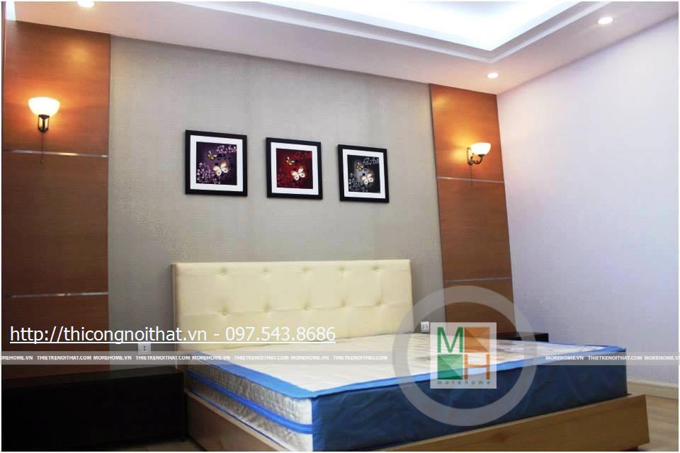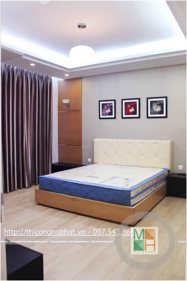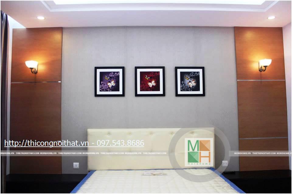 Phòng ngủ của vợ chồng chị Thủy với nội thất trong phòng được trang trí đơn giản nhưng không vì thế mà mất đi sự ấm áp, lãng mạn. bộ giường ngủ đặt ở vị trí gần cửa sổ để đón ánh nắng mặt trời. Morehome cũng thiết kế ba bức tranh nhỏ cạnh đầu giường giúp kohoong gian càng trở nên hoàn thiện hơn.
