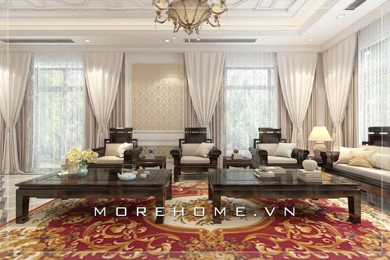 Không gian phòng khách tân cổ điển được thiết kế theo phong cách tân cổ điển mang lại vẻ đẹp sang trọng, để lại ấn tượng sâu sắc cho gia chủ