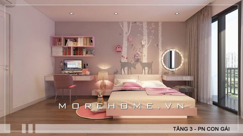 Bố trí nội thất phòng ngủ cho bé gái phong cách hiện đại sử dụng tone màu hồng tạo cảm giác dễ thương và nhẹ nhàng