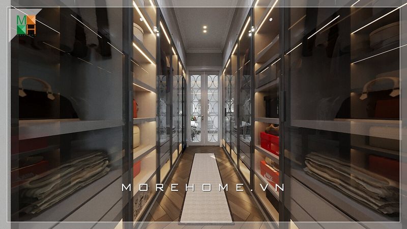Tủ quần áo rộng chạy dài được chia ngăn tiện lợi là mẫu thiết kế nội thất cao cấp dành riêng cho nhà phố