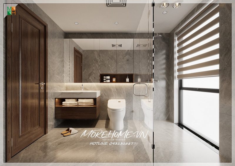 Để tạo cảm giác rộng rãi cho không gian phòng tắm không rộng, lựa chọn màu sáng cho gạch lát sàn và đá ốp tường là một giải pháp tốt.