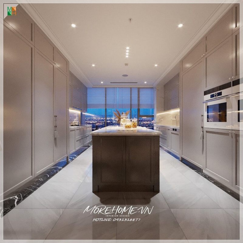 Phòng bếp được thiết kế theo phong cách tân cổ điển với đường nét chạm khắc uyển chuyển, tạo ra một không gian sang trọng và đẳng cấp với tính thẩm mỹ cao.